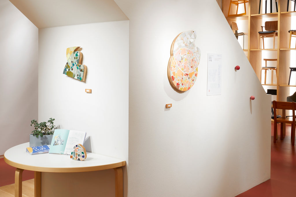 Artek Tokyo Storeの地下1階では、インテリアシーンに溶け込むように、AYA IWAYAが日本の多治見で製作したモザイクタイルによる造形作品が展示されています。壁に掲示されたものから手のひらサイズのものまで、展示作品はすべて販売され、図録もご用意しています。