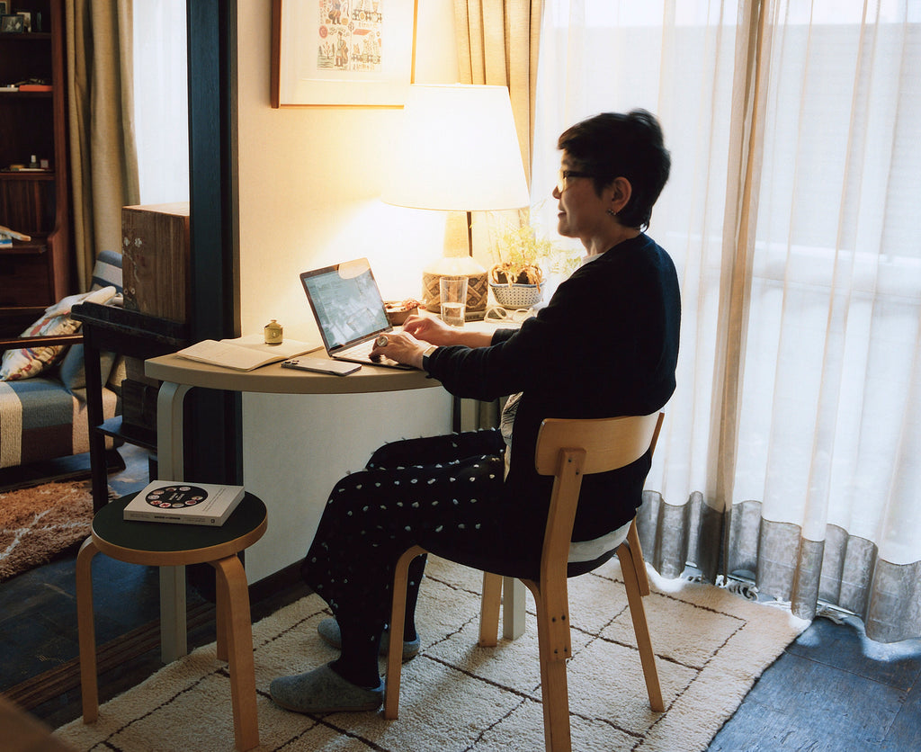 移動も車ですし、大きな変化は感じていませんが、一番変わった点はやはりリモート会議でしょうか。打ち合わせのみであれば現地には行かず、リモート会議で事足りることが増えました。インテリアスタイリストという仕事柄、リモート会議中の画面越しの背景、自分や相手の部屋や壁面が気になってしまいます。そのため、デスクワークは「95 テーブル」で、リモート会議の際には「69 チェア」を窓際のコーナーに移動して、お気に入りのものを並べている棚の前でリモート会議をするようになりました。