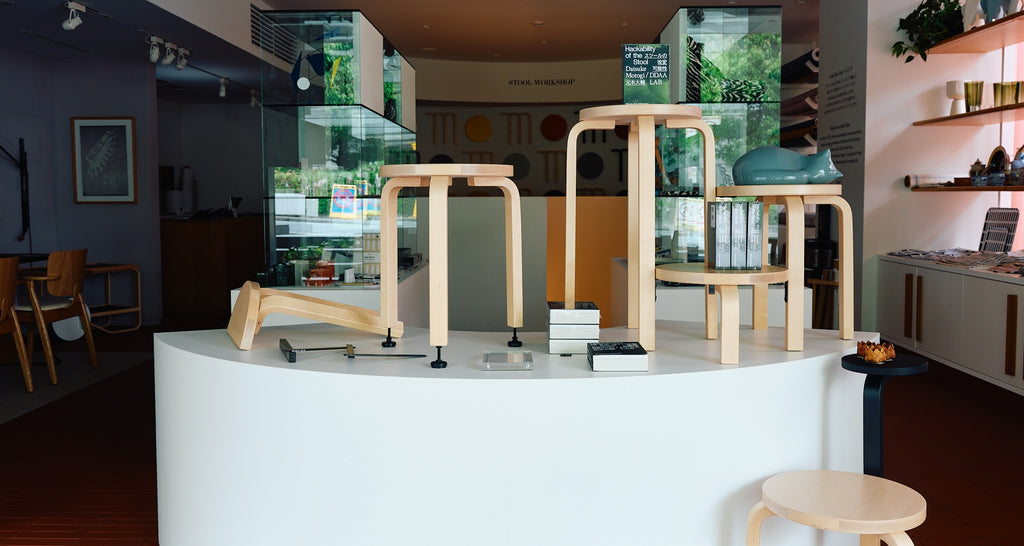 そして、今回は形を変え、展覧会で展示された100脚の中から30点前後の改変スツールを選び、Artek Tokyo Store店内のインテリアシーンに溶け込みながらも、日々の暮らしの中での使用を想像できるような展示を体験していただけます。