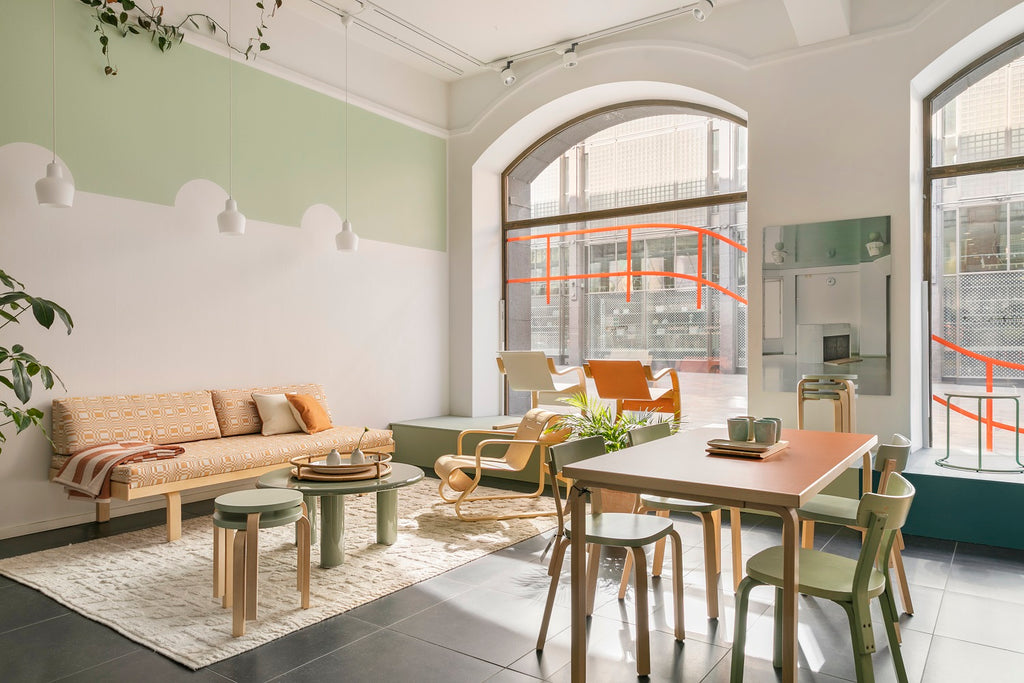 アルテックの直営店であるArtek Helsinkiは、アルテック創業の翌年、1936年にオープンしました。幾度かの移転を経て2023年の現在までヘルシンキの中心部に居を構え、フィンランドの国内外に向けてアルテックの哲学、フィンランドデザインと文化を発信し続けています。アルテック製品だけでなく、同じ哲学を共有するさまざまなブランドを合わせ、インテリアシーンとして表現しているArtek Helsinkiでは、現在、今年で竣工90周年を迎えるパイミオのサナトリウムのアニバーサリー製品やパイミオのカラーにフォーカスした展示をご覧いただけます。