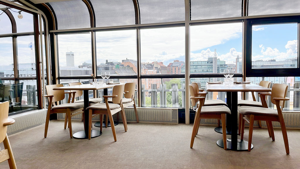 ヘルシンキの中心地にあるAlexanderplatsは、柔らかな印象のレザー張りドムスチェアが並ぶ心地よい空間とテラスが併設された、気軽で粋なレストランです。