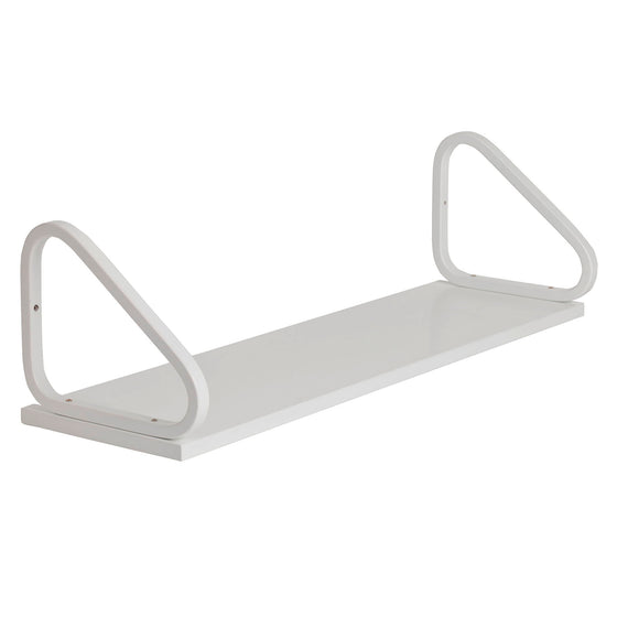 「壁付け棚 112」は、バーチ材の合板を曲げて形作った小さな三角形のループがブラケットとなり、しっかりとした天板を両端で支えています。三角形のループは、「ラメラ曲げ木」という技法により、合板でありながらもまるで無垢の一本木のように滑らかな見た目をしています。三角形のループを上に向けても、下に向けても、ウォールシェルフとして使うことができ、ループを上向きにして設置すると、ブックエンド付きの本棚として使うことができます。アルヴァ・アアルトらしい、実用性と機能性、そしてシンプルで柔らかな美しさを兼ね備えたウォール シェルフです。