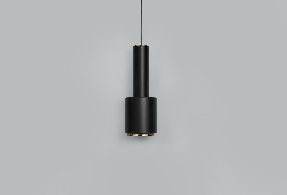 その形から「手榴弾」とも称される「ペンダント A110 手榴弾」は、1952年にアアルトがフィンランド技術協会のプロジェクトのためにデザインし、アアルトの代表的な建築の一つであるセイナッツァロ役場の会議室でも使用されていました。スチール製の本体と、ランプシェードの下に穴をあけた真鍮のリングを取り付けた構造により、光は輪のように拡散され、柔らかく温かな光として放たれます。 - Materials