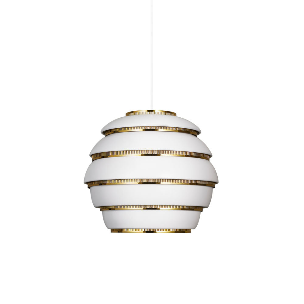 「ペンダント A331 ビーハイブ」は、アルヴァ・アアルトが手掛けた照明の中でも高い人気を誇るデザインのひとつです。1953年、フィンランドのユバスキュラにある大学のためにデザインされ、アルヴァ・アアルトによる照明の代表として、今もなお「Beehive(蜂の巣)」の愛称で親しまれています。その存在感あるデザインと柔らかな光は、住宅だけでなくレストランやカフェ、公共の空間にも馴染みます。蜂の巣形のシェードの隙間に層のごとく差し込まれるスチール製のブラスメッキリングには等間隔に穴が刻まれ、その工夫により光の直接的なまぶしさは軽減され、柔らかく空間を照らし出します。