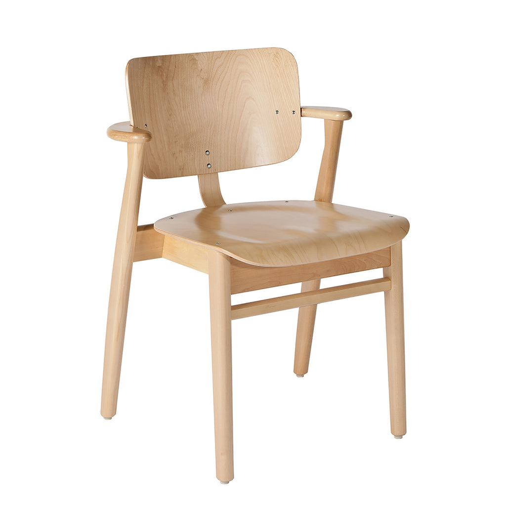 近代的な家具デザインの名作とも称される「ドムス チェア」は、イルマリ・タピオヴァーラにより、ヘルシンキの学生寮「ドムス アカデミカ」のためにデザインされました。高い評価を受けた「ドムス チェア」は、フィンランドを代表する椅子として「フィンチェア」という愛称でも呼ばれるようになります。三次元に曲線を描く、人の身体に沿った座面など、長期間座っても疲れにくく、心地良く過ごせるデザインを追及しています。特徴的な小さめの肘掛けは、肘置きとしての役割をきちんと果たしながら、テーブルに椅子を引き寄せやすいように考慮されています。1946年に誕生した「ドムス チェア」は、今もなお、世界中で愛され続けています。 -