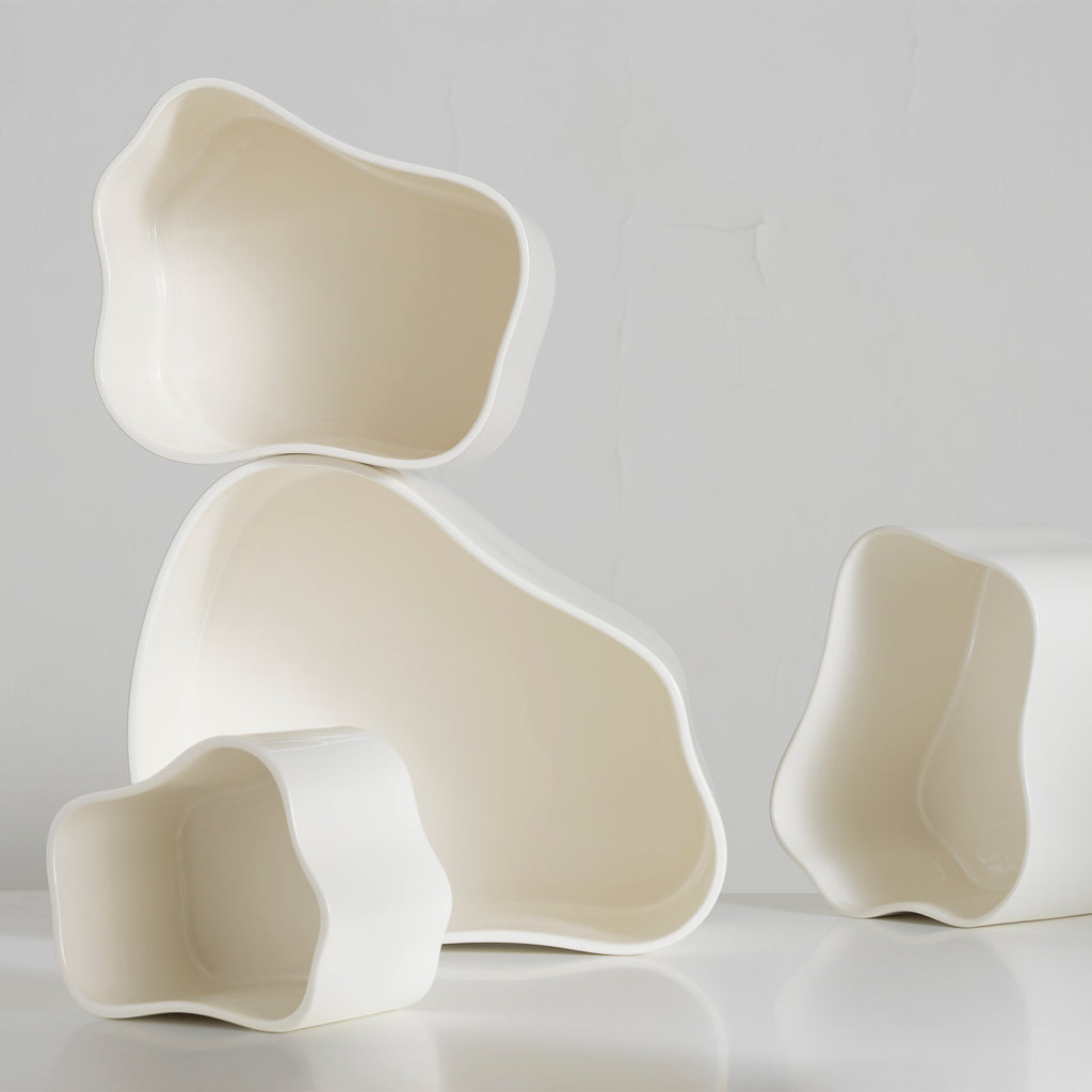 セラミック製の「リヒーティエ プラント ポット」は、ヘルシンキ、リーヒティエ通りにあるアアルト自邸のためにアイノ・アアルトがデザインしました。自然や自然素材に対して親しみ、そして、プロダクトの細部に至るまで大切にするアルヴァ・アアルトとアイノ・アアルトの信念を具現化した製品ともいえます。この植木鉢は、1937年のパリ万博で展示され注目を集めたものの、当時は製品化にまで至りませんでしたが、2017年に屋内用として2つの形と3つのサイズで製品化しました。アアルトの主な建築に用いられているタイルから着想を得た素材を選び、ひとつひとつ人の手によって作られています。