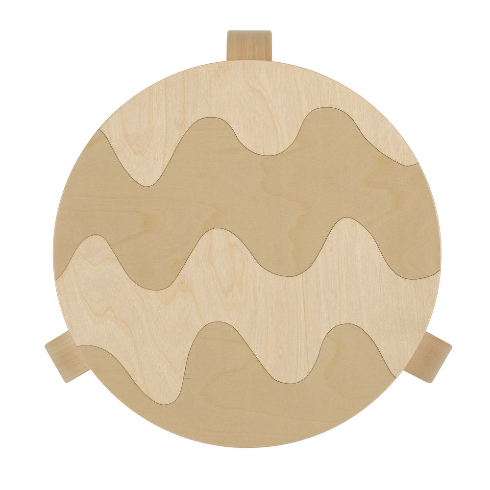座面の突板をパターンの形に切り取り、それを別個体の該当箇所にはめ込む象嵌(ぞうがん)の技術を用いた斬新な形のコラボレーションにより、マイヤ・イソラのプリントデザインが、木目と木地のコントラストに変換されています。