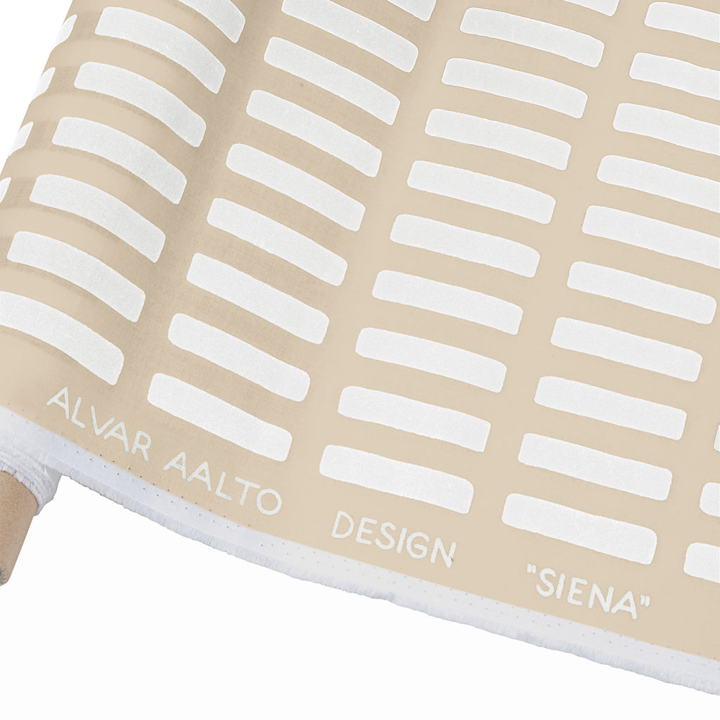 アルヴァ・アアルトが1954年にデザインしたテキスタイルパターン「シエナ」は、アアルト夫妻が幾度も訪れたイタリアの都市の街並みと、ドゥオモ広場に位置するシエナ大聖堂に着想を得て描かれたと言われています。「ブリック / サンド シャドー」は、ムーラッツァロ島の実験住宅と呼ばれる夏の家や、マサチューセッツ工科大学内ベーカーハウス学生寮などに使われた赤レンガを表現しています。